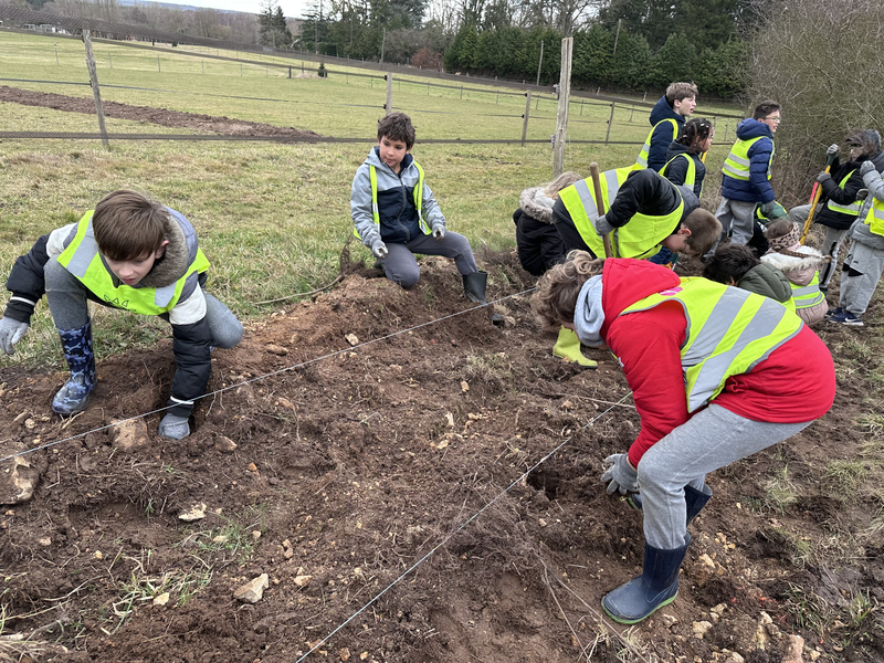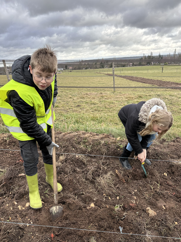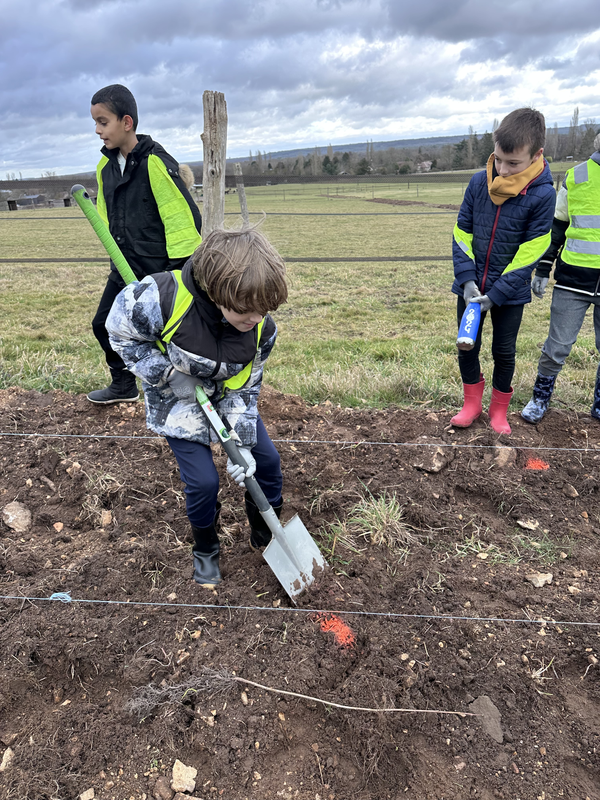 L’après-midi, les élèves sont passés à l’action ! Équipés de gants et de pelles, ils ont participé à la plantation des haies. Chaque enfant a creusé un trou d’environ 30 cm, planté son arbre, puis installé une petite étiquette avec son prénom. Un moment très concret et valorisant pour eux.